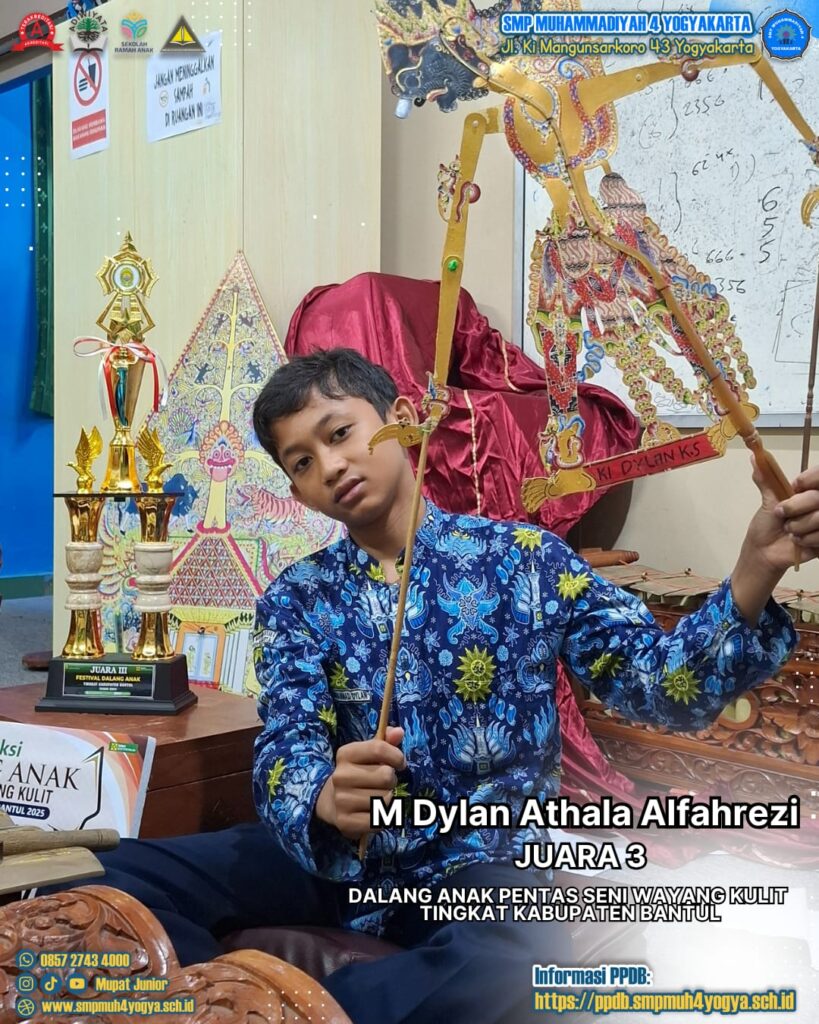 Prestasi kembali diraih oleh siswa SMP Muhammadiyah 4 Yogyakarta. Adalah Muhammad Dylan Athala Alfahrezi, siswa berprestasi yang berhasil meraih juara 3 dalam Festival Dalang Anak dan Remaja Tingkat Kabupaten Bantul tahun 2025 yang digelar oleh Dinas Kebudayaan (Kundha Kabudayan).