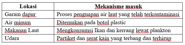 Tanpa kita sadari, hampir setiap hari kita mengkonsumsi mikropastik. Hasil Riset Micro Ecoton Sofi Azilan Aini mengatakan masuknya Mikroplastik ke dalam tubuh melewati tiga jalur. Inhalasi (pernapasan), konsumsi makanan dan paparan kulit.